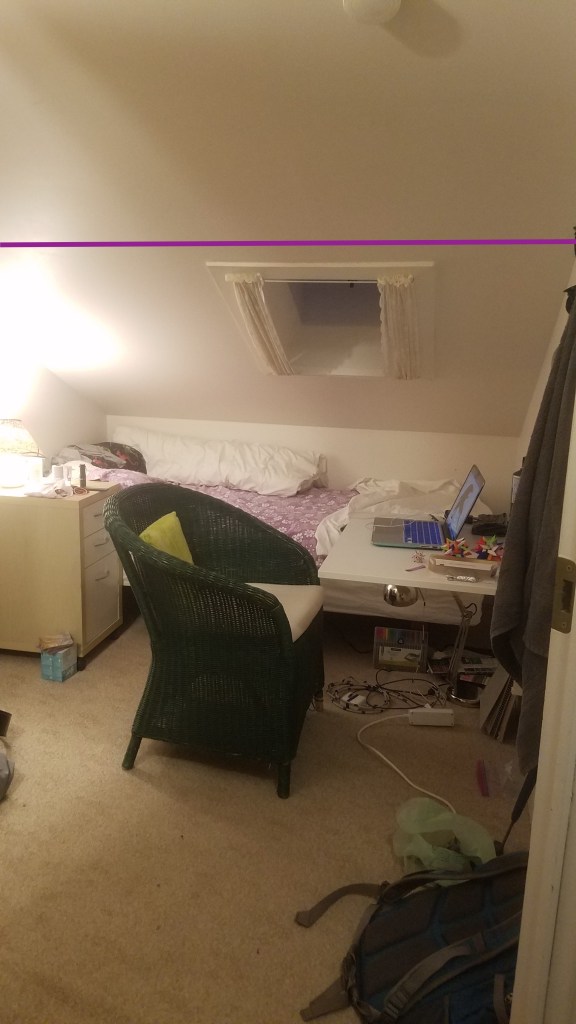 The place I’m living used to be a house that was then cut into three apartments, and each apartment has three students in it. My third of a third of a house is up two truly terrifying twisty staircases, with kitchen and living room on the second floor and bedrooms on the third. Medieval siege engineers would kill for my stairs in their towers they are so steep and corkscrewed. My room in particular in entirely under the eaves, so the whole roof is slanted to the point I can only stand upright in about 2/3 of the room. But also I have a skylight and I can’t complain.