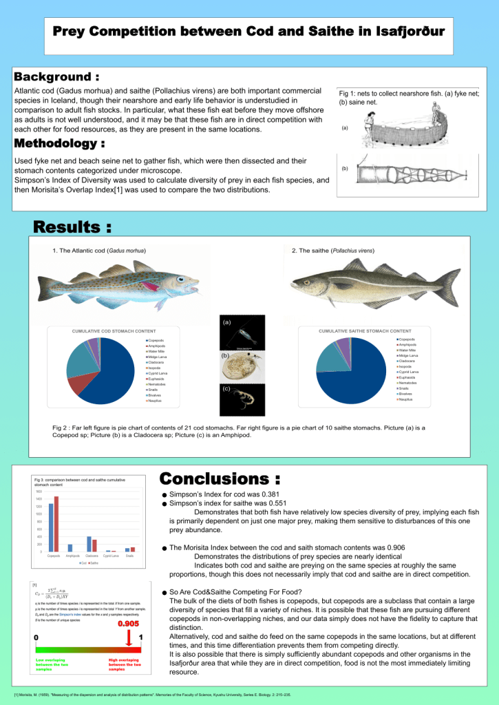 We did a very haphazard poster session this morning. Everybody had put their data from their 5ish fish they each dissected about a week and a half ago in a spreadsheet so we all had a reasonable sample set to work with, and then we all picked slightly different (very related) topics to slap together a poster about. My partner had a biology background, so he suggested that we calculate a relatively well known diversity index (Simpson’s, for the biologists in the audience) to see if cod and saithe (the two major fish species in the area) were were eating a well balanced diet of tiny swimmy things, or primarily one swimmy thing. We then used that index to calculate a much less well known comparison index (Morisita Overlap Index) between the two fish to see if they were eating the same things in the same proportions.