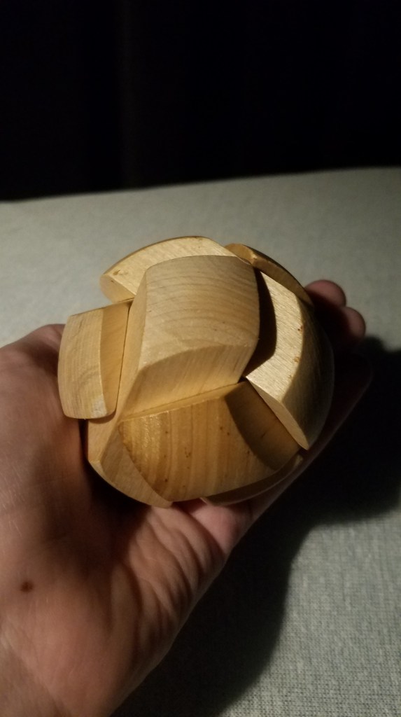 I also took a chunk of today to wander through the booth section and actually talk to people (which I completely forgot to do yesterday). One group had a wooden puzzle on the table that I beelined towards, picked up, and poked, before actually introducing myself and talking to the guy at the table. He said, If you can solve it, you can keep it. So I starting fiddling with it while asking him about what his group does (gets polar research institutions to talk to each other, mostly) and I solved it! which caused the entire booth to go a little nuts because apparently no one had manged to all day. So I showed them the trick, and they handed me a box. So I won a puzzle today, if nothing else.