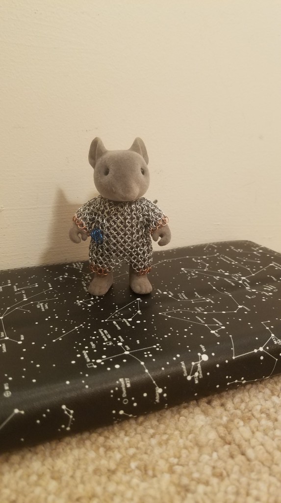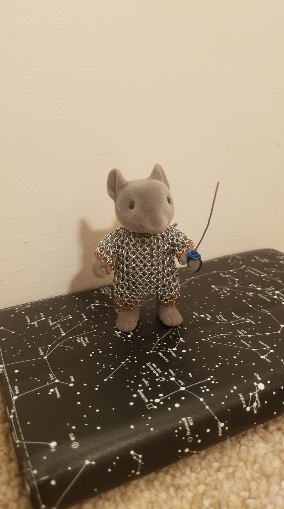 it’s much easier to make a mouse sized costume than a person (even a me-sized person) sized one, and the armpits are much simpler. I had a delightful time making a little rapier out of a paperclip too